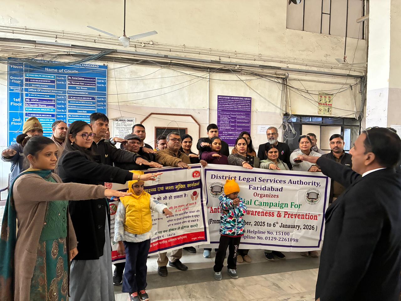 Read Moreड्रग-फ्री हरियाणा मिशन के अंतर्गत एंटी-ड्रग शपथ कार्यक्रम आयोजित फरीदाबाद, 03 जनवरी।डिस्ट्रिक्ट लीगल सर्विसेज अथॉरिटी (DLSA), फरीदाबाद द्वारा ड्रग-फ्री हरियाणा मिशन के अंतर्गत जिला न्यायालय परिसर, सेक्टर-12, फरीदाबाद में एंटी-ड्रग शपथ कार्यक्रम का आयोजन किया गया। इस कार्यक्रम का उद्देश्य नशे के दुष्प्रभावों के प्रति जागरूकता बढ़ाना तथा लोगों को स्वस्थ, अनुशासित और नशामुक्त जीवन अपनाने के लिए प्रेरित करना। यह कार्यक्रम संदीप गर्ग, जिला एवं सत्र न्यायाधीश-सह-अध्यक्ष, डीएलएसए, फरीदाबाद के मार्गदर्शन में आयोजित किया गया तथा इसकी अध्यक्षता एवं पर्यवेक्षण रितु यादव, मुख्य न्यायिक मजिस्ट्रेट-सह-सचिव, डीएलएसए, फरीदाबाद द्वारा किया…