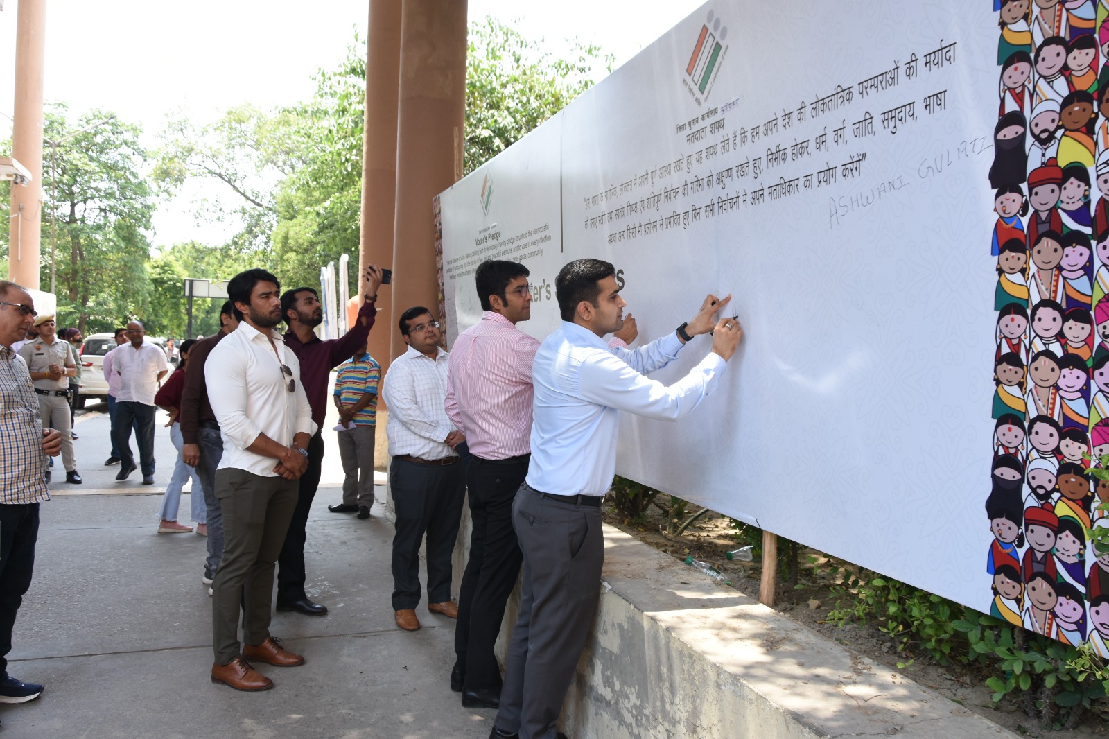 Read Moreजिला निर्वाचन अधिकारी ने डमी ईवीएम के लोकार्पण के साथ हस्ताक्षर अभियान का किया शुभारंभ – मतदाताओं को जागरूक करने के लिए चला रहे विशेष अभियान, मतदान प्रतिशत को 70 प्रतिशत ले जाने का लक्ष्य: विक्रम सिंह – लोकतंत्र के महापर्व चुनाव में हर मतदाता करे भागीदारी, मताधिकार का प्रयोग अनिवार्य रूप से करें – जिला निर्वाचन अधिकारी के आह्वान पर लोगों ने हस्ताक्षर करते हुए ली मतदान करने की शपथ फरीदाबाद, 15 मई। मतदाताओं को जागरूक करने के उद्देश्य से जिला निर्वाचन अधिकारी एवं उपायुक्त विक्रम सिंह ने लघु सचिवालय में डमी इवीएम का लोकार्पण करते हुए…