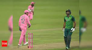 The stumper pointed his finger towards Lungi Ngidi but the ball was, in fact, thrown by Aiden Markram towards the keeper’s end and it was a direct hit. Zaman had slowed down his pace at the end of his second run and could not make it back into his crease.
