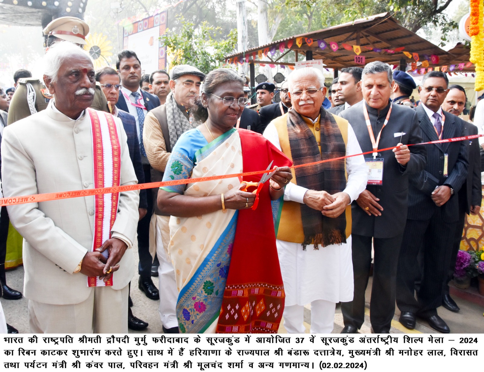 फरीदाबाद, 02 फरवरी। हरियाणा के सूरजकुंड में आज 37वें सूरजकुंड अंतरराष्ट्रीय शिल्प मेला-2024 का भव्य आगाज हुआ, जो 18 फरवरी तक चलेगा। भारत की राष्ट्रपति श्रीमती द्रौपदी मुर्मू द्वारा 37वें सूरजकुंड अंतरराष्ट्रीय शिल्प मेला का उद्घाटन किया गया। इस अवसर पर हरियाणा के राज्यपाल श्री बंडारू दत्तात्रेय और मुख्मयंत्री श्री मनोहर लाल सहित कई गणमान्य अतिथियों की गरीमामयी उपस्थिति रही।